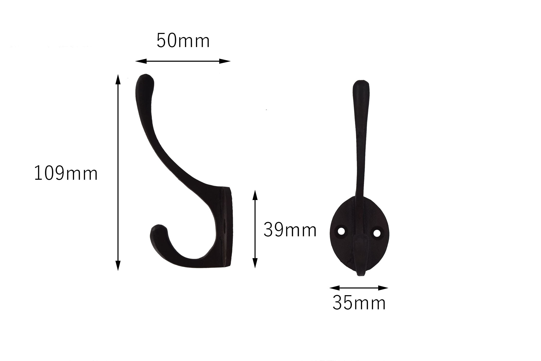 チューダースタイルのフックは壁面からの立ち上がりが少なく(壁にとりつけた時に出っ張りが少ない)ので、通路やクローゼットの中等、狭い場所でも使いやすくなっています。※写真は同サイズのガンブラックのフックを使用。